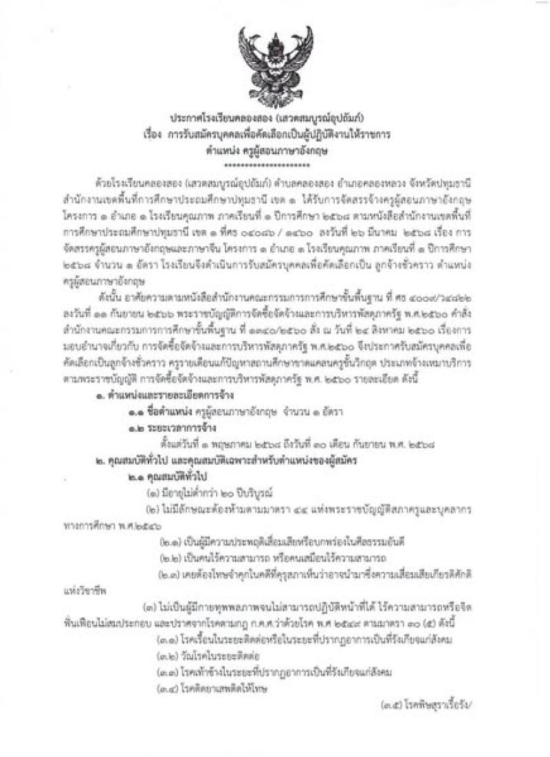 ประกาศโรงเรียนคลองสอง (เสวตสมบูรณ์อุปถัมภ์) เรื่อง การรับสม..