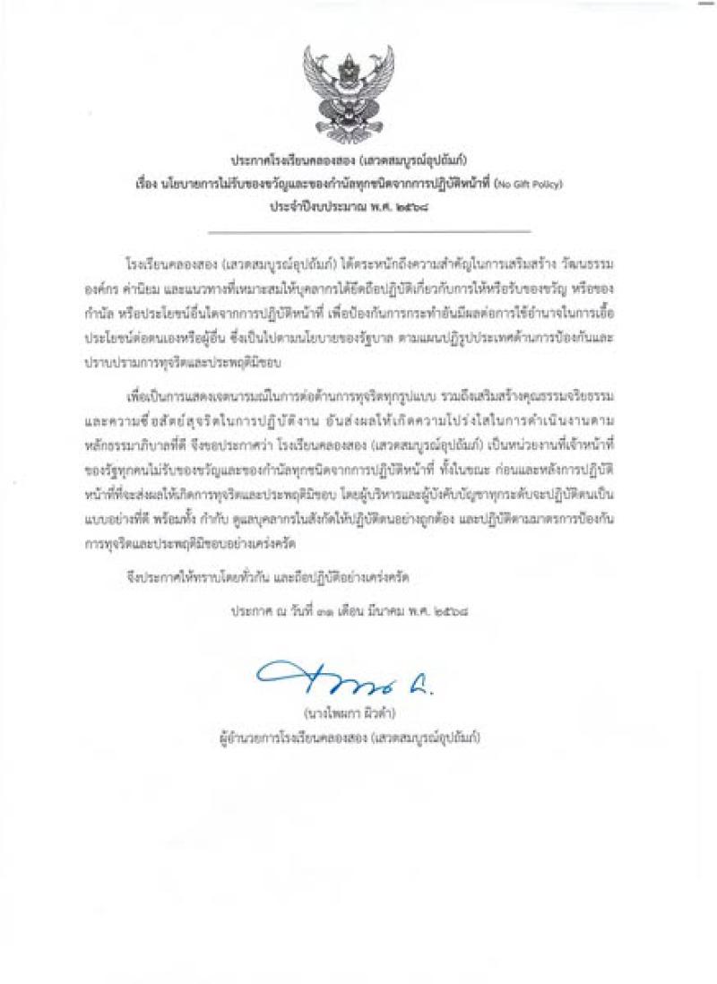 ประกาศโรงเรียนคลองสอง (เสวตสมบูรณ์อุปถัมภ์) เรื่อง นโยบายการ..