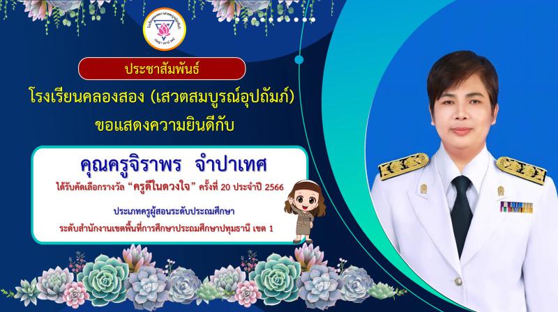 ขอแสดงความยินดีกับคุณครูจิราพร จำปาเทศ ได้รับคัดเลือกรางวัล “ครูดีในดวงใจ” ครั้งที่ 20 ประจำปี 2566 ..