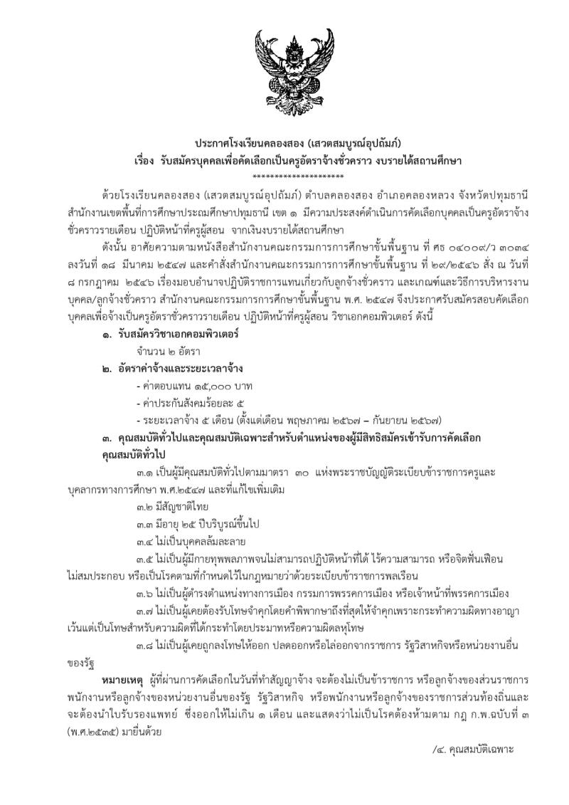 ประกาศโรงเรียนคลองสอง (เสวตสมบูรณ์อุปถัมภ์) เรื่อง รับสมัครบุคคลเพื่อคัดเลือกเป็นครูอัตราจ้างชั่วครา..