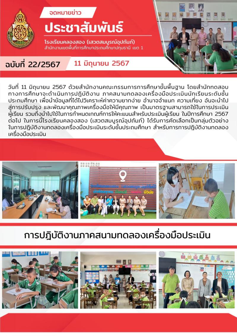 โรงเรียนคลองสอง (เสวตสมบูรณ์อุปถัมภ์) ได้รับการคัดเลือกเป็นกลุ่มตัวอย่างในการปฎิบัติงานทดลองเครื่องม..